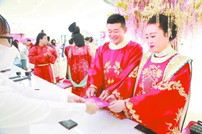 8对“零彩礼”新人,传统服饰,不同朝代的礼仪如敛衽礼、肃拜礼、叉手礼、万福礼、揖礼,以及传统婚礼中的却扇、沃盥、同牢、合卺、结发等,凸现传统文化的气韵,让观众仿佛穿越到千年之前。这是前不久内蒙古自治区赤峰市红山区举办的“大美婚俗、红山见证”集体婚礼暨青年联谊活动的情景。活动设置了主题公园、传承家风、婚俗倡议、幸福之门、诗词颁证台、现代诗词赏析、爱情斑马线等20多处打卡点,浸润全新的婚姻理念。