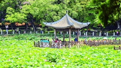 6月18日,人们在南宁市南湖公园荷花亭观赏荷花。 连日来,广西南宁南湖公园荷花盛开,吸引众多市民和游客前来观赏。