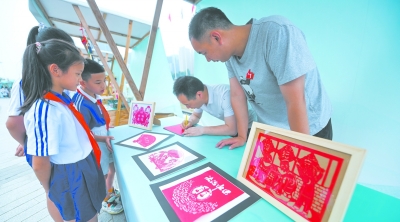 6月16日,学生们在法治游园会上观看制作法治文化为主题的剪纸。