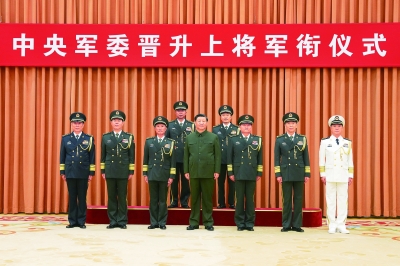 晋衔仪式在嘹亮的军歌声中结束。随后,习近平等领导同志同晋升上将军衔的军官合影。
