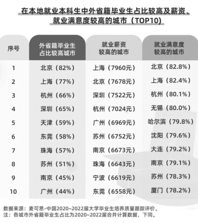 除一线城市中,京沪吸引力更强劲外,新一线城市人才流入表现也不俗。蓝皮书显示,在杭州就业的本科生中,外省籍毕业生占比较高,达到了66%;其次是天津、东莞、苏州,分别为59%、58%、51%;而在薪资方面,根据蓝皮书统计,2022届本科毕业生毕业半年后,平均月收入分别为7024元、6752元、6673元;杭州、苏州、南京本科生薪资在新一线城市中位列前三,其本科毕业生就业满意度分别为80.1%、78.3%、79.1%。