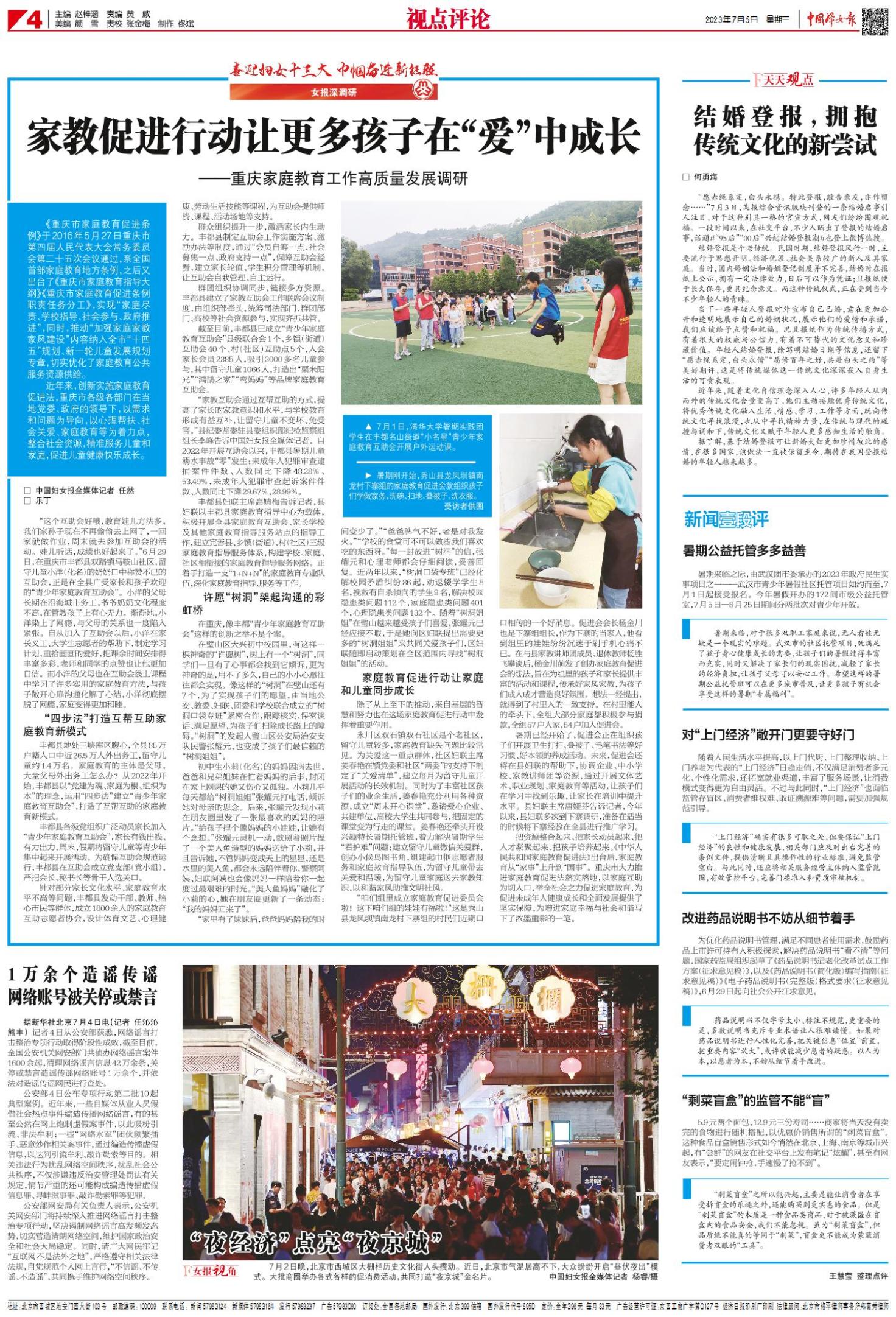 《中国妇女报》(电子版)的一切内容(包括但不限于文字、图片、PDF、图表、标志、标识、商标、版面设计、专栏目录与名称、内容分类标准以及为读者提供的任何信息)仅供中国妇女报读者阅读、学习研究使用,未经中国妇女报及/或相关权利人书面授权,任何单位及个人不得将《中国妇女报》(电子版)所登载、发布的内容用于商业性目的,包括但不限于转载、复制、发行、制作光盘、数据库、触摸展示等行为方式,或将之在非本站所属的服务器上作镜像。否则,中国妇女报将采取包括但不限于网上公示、向有关部门举报、诉讼等一切合法手段,追究侵权者的法律责任。