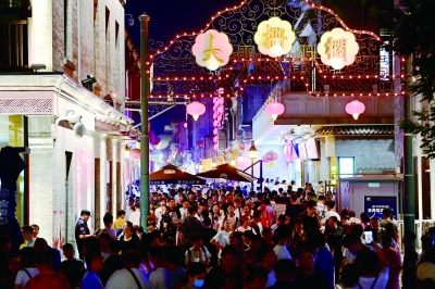 7月2日晚,北京市西城区大栅栏历史文化街人头攒动。近日,北京市气温居高不下,大众纷纷开启“昼伏夜出”模式。大批商圈举办各式各样的促消费活动,共同打造“夜京城”金名片。中国妇女报全媒体记者 杨睿/摄