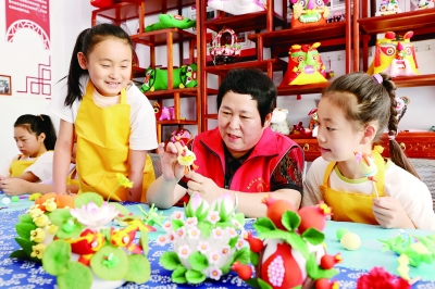 7月13日,孩子们在山东省枣庄市龙山路街道民间艺术志愿者工作室学习面塑制作技艺。暑假期间,各地的孩子们参加丰富多彩的课外活动,学知识,开眼界,长本领,乐享暑假时光。 新华社发(孙中喆/摄)
