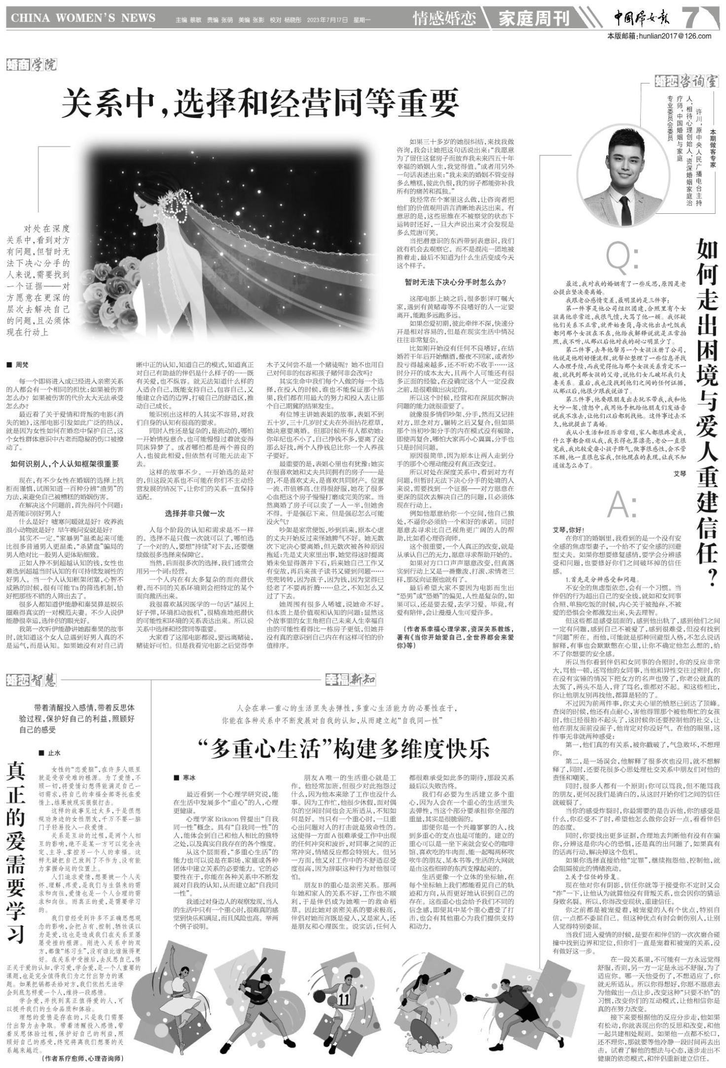 《中国妇女报》(电子版)的一切内容(包括但不限于文字、图片、PDF、图表、标志、标识、商标、版面设计、专栏目录与名称、内容分类标准以及为读者提供的任何信息)仅供中国妇女报读者阅读、学习研究使用,未经中国妇女报及/或相关权利人书面授权,任何单位及个人不得将《中国妇女报》(电子版)所登载、发布的内容用于商业性目的,包括但不限于转载、复制、发行、制作光盘、数据库、触摸展示等行为方式,或将之在非本站所属的服务器上作镜像。否则,中国妇女报将采取包括但不限于网上公示、向有关部门举报、诉讼等一切合法手段,追究侵权者的法律责任。