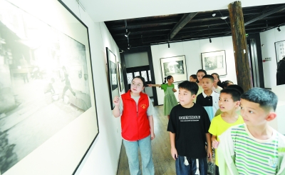 7月19日,青少年在小西街一家美术馆观看老街历史照片。 暑假期间,浙江省湖州市吴兴区历史文化街区小西街迎来许多研学的青少年。他们在这里了解城市历史、开阔视野,展开多彩的暑期生活。