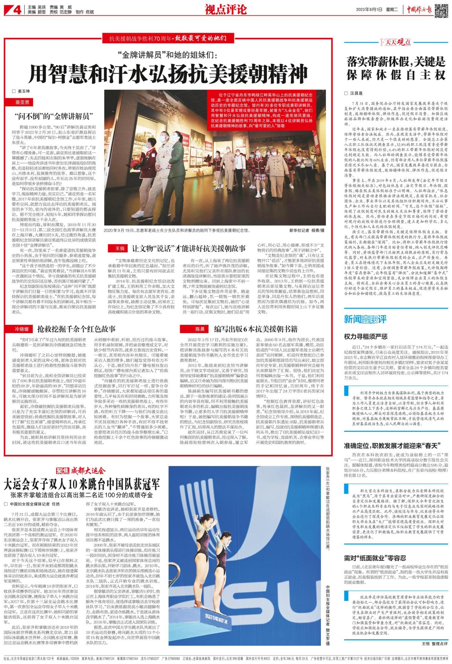 《中国妇女报》(电子版)的一切内容(包括但不限于文字、图片、PDF、图表、标志、标识、商标、版面设计、专栏目录与名称、内容分类标准以及为读者提供的任何信息)仅供中国妇女报读者阅读、学习研究使用,未经中国妇女报及/或相关权利人书面授权,任何单位及个人不得将《中国妇女报》(电子版)所登载、发布的内容用于商业性目的,包括但不限于转载、复制、发行、制作光盘、数据库、触摸展示等行为方式,或将之在非本站所属的服务器上作镜像。否则,中国妇女报将采取包括但不限于网上公示、向有关部门举报、诉讼等一切合法手段,追究侵权者的法律责任。