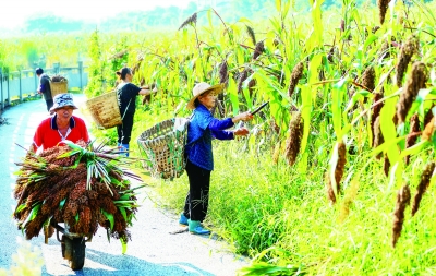 江阳区黄舣镇永兴村村民在收割高粱。 盛夏时节,四川省泸州市高粱进入收获季,村民趁晴好日子抓紧抢收。 新华社发(刘学懿/摄)