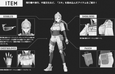 她的头发和眼睛是绿色的,因为绿色是公司的代表色。此外,她身上有许多航空元素,护目镜采用了飞机前窗的样式,胸口和手套的原型是飞机的滑行道,肩膀上参考了机翼的设计,腰间还挂着一个行李箱样式的小包。