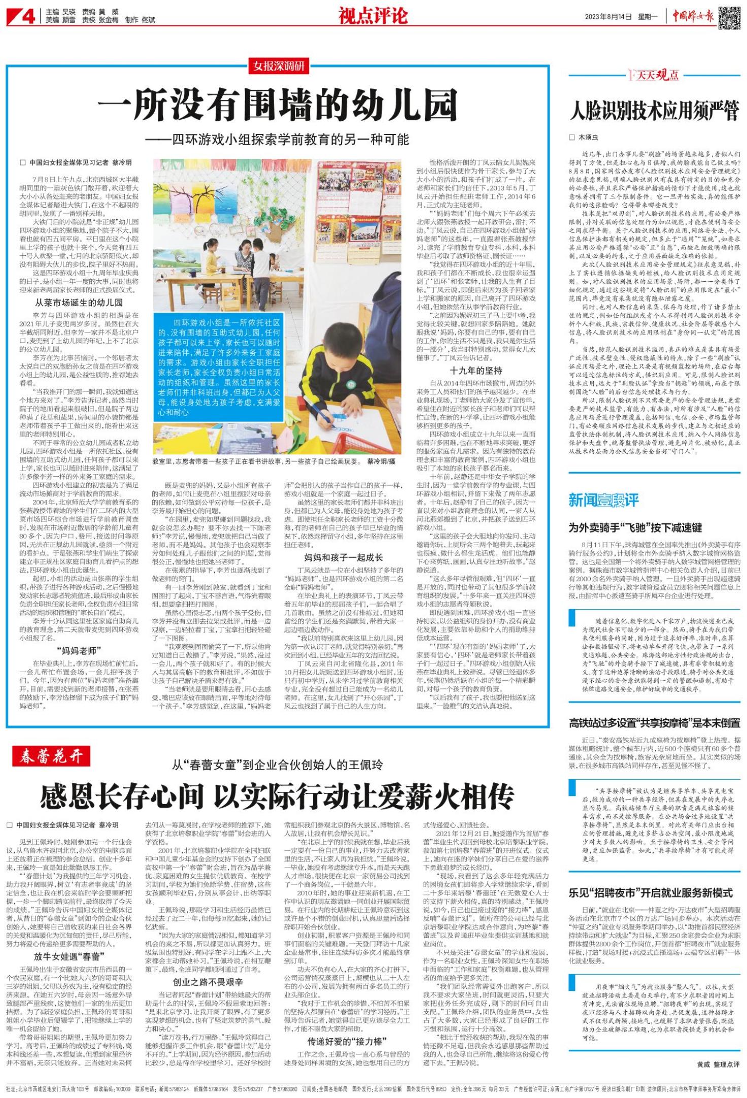 《中国妇女报》(电子版)的一切内容(包括但不限于文字、图片、PDF、图表、标志、标识、商标、版面设计、专栏目录与名称、内容分类标准以及为读者提供的任何信息)仅供中国妇女报读者阅读、学习研究使用,未经中国妇女报及/或相关权利人书面授权,任何单位及个人不得将《中国妇女报》(电子版)所登载、发布的内容用于商业性目的,包括但不限于转载、复制、发行、制作光盘、数据库、触摸展示等行为方式,或将之在非本站所属的服务器上作镜像。否则,中国妇女报将采取包括但不限于网上公示、向有关部门举报、诉讼等一切合法手段,追究侵权者的法律责任。