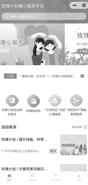 近期,由广东省广州市发布针对困境母亲需求开发的“玫瑰计划暖心服务平台”微信小程序,小程序内设置了“玫瑰妈妈岗”“玫瑰计划活动预约报名”“‘与您同在’法律心理服务”“‘向阳花开’家庭教育服务”等特色服务板块,为困境母亲、志愿者以及社会爱心力量等提供资讯信息、就业创业岗位、活动报名、志愿招募、资源链接等功能服务,增强困境母亲及其家庭的社会支持。