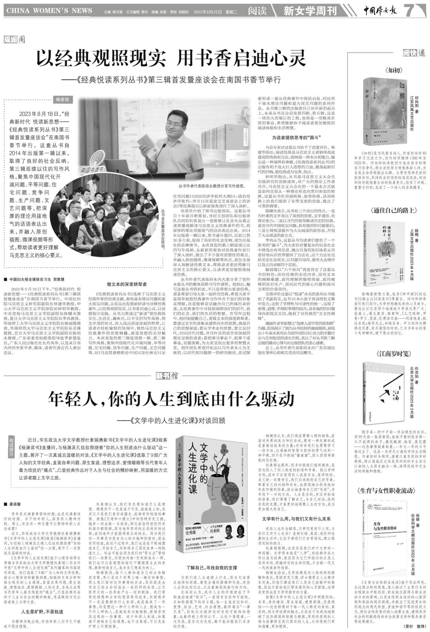近日,华东政法大学文学教授杜素娟携新书《文学中的人生进化课》做客《杨澜读书》直播间,与杨澜及孔钰钦围绕着“你的人生到底由什么驱动”这一主题,展开了一次真诚且温暖的对谈。《文学中的人生进化课》选取了9部广为人知的文学经典,直面自卑问题、原生家庭、理想追求、爱情婚姻等当代青年人最为烦扰的“痛点”,凸显经典作品对于人生与社会的精妙映射,用温暖的方式让读者踏上文学之旅。