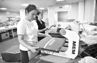 8月29日,工人在河北省威县姜七里村一家服饰厂对加工服饰进行压花作业。近年来,河北省邢台市威县实施“筑巢引凤”就业工程,积极拓宽农村劳动力就业渠道,立足县域实际,引导服饰、箱包、制鞋等各类“微工厂”进镇入村,采取短期用工、季节用工、临时用工等多种灵活方式,将就业岗位送到村民家门口,不断吸纳农村劳务人员留乡回乡就业。目前,威县已发展村镇“微工厂”200余家,吸纳8000余名村民就地实现就业。新华社记者 朱旭东/摄