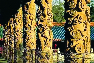 提起建筑上的龙,大家会想起北京故宫太和殿的蟠龙金柱,而曲阜孔庙大成殿里的龙柱,在我看来更胜一筹。孔子被誉为“素王”,其开创的儒家思想自汉武帝“废除百家独尊儒术”之后,被历代统治者所尊崇,特别是宋真宗天禧年间,又封孔子为“大成至圣文宣王”,龙自然能与其身份地位相匹配。资料显示,大成殿用龙柱始于金代,明弘治庙火后征调徽州工匠重刻,清雍正火后又重建。十根高浮雕云龙盘柱,每柱二龙对翔,盘绕升腾,中刻宝珠,四绕云焰,下饰莲花石座。十根龙柱两两相对,各具变化,无一雷同,造型优美生动,刀法刚劲有力,可谓曲阜独有的石刻艺术瑰宝。