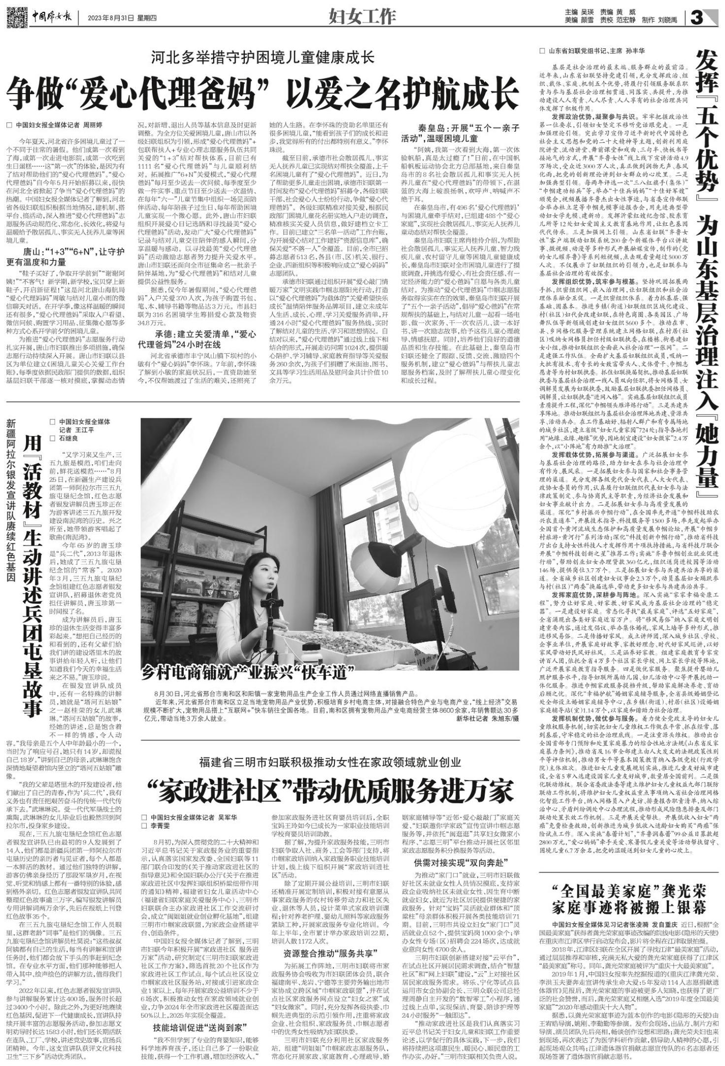 为拓展工作阵地,三明市妇联将市家政服务协会吸收为市妇联团体会员,联合福建南平、龙岩、宁德等主要劳务输出地市家协成立跨区域“巾帼家政联盟”,并在试点社区家政服务网点设立“妇女之家”或“妇女微家”。同时,充分发挥各级执委、巾帼先进典型的示范引领作用,注重将家政企业、社会组织、家政服务员、巾帼志愿者中的优秀女性吸纳为妇联执委。