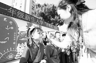 8月31日,河北省邯郸市峰峰矿区滏北小学的老师在“开笔礼”仪式上给一年级新生点朱砂。最近,各地学校陆续开启新学期。 新华社发 郝群英/摄