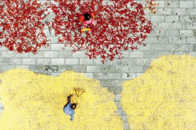 9月1日,村民在贵州省黔西市谷里镇香山社区法治广场翻晒玉米和辣椒(无人机照片)。    秋收季节,为确保颗粒归仓,贵州多地基层抢抓农时,采取挪车、清除杂物等举措,把政府大院、广场、院落、操场等地腾空,作为村民晾晒农作物的晒场。新华社发(范晖/摄)