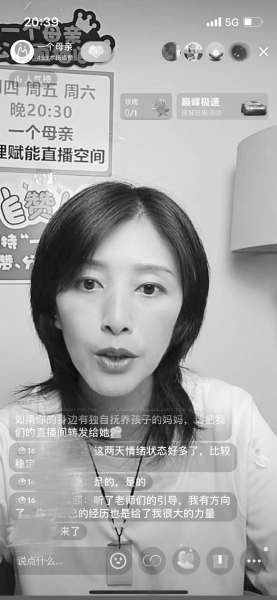 余芳芳与另外两位老师在抖音轮班开设直播课程,每次两个小时,为全国各地的单亲妈妈提供心理、法律等方面的服务。由于是匿名连线,注重隐私的妈妈们可以以更低的心理成本在直播间获得即时的互动与帮助。