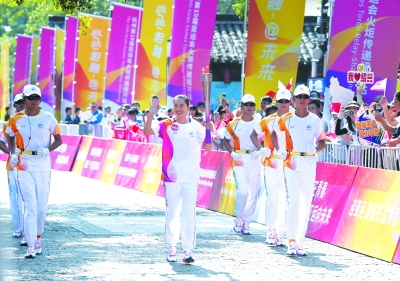 9月11日,火炬手陆敏佳在火炬传递中。当日,杭州亚运会火炬在浙江省绍兴传递。新华社记者 徐昱/摄