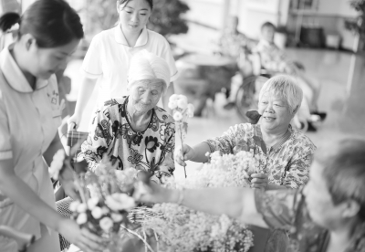 9月11日,在河北省滦州市王店子镇海洋养老中心,医务人员和老人们一起练习插花艺术。 近年来,河北省滦州市积极推进医养、康养结合养老模式,集养老护理、医疗康复、休闲娱乐于一体,建起多层次养老服务体系,推动养老服务事业发展,提升老年人的幸福感。 新华社记者 杨世尧/摄