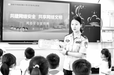 9月11日,在江苏省海安经济开发区实验小学,海安市公安局城东派出所民警在给小学生普及网络安全知识。    当日,江苏省海安经济开发区实验小学联合海安市公安局城东派出所开展“网络安全宣传进校园”活动,通过观看展板、幻灯片演示、互动问答等形式,引导小学生了解网络安全知识,提升网络文明素养。新华社发(翟慧勇/摄)