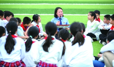 9月14日,江苏省兴化市检察院未成年人法治宣讲团的工作人员走进兴化市文峰小学,通过讲故事的方式给学生讲解网络安全知识。 9月11日至9月17日是2023年国家网络安全宣传周。宣传周期间,各地开展形式多样的网络安全知识宣传活动,提高人们的网络安全意识,共筑网络安全防线。 新华社发(周社根/摄)