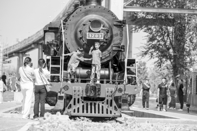河北省邯郸市复兴区邯钢三炼钢大门北侧钢花风情街,粉刷一新的火车头和车厢迎接到此打卡游玩的市民。聂长青/摄