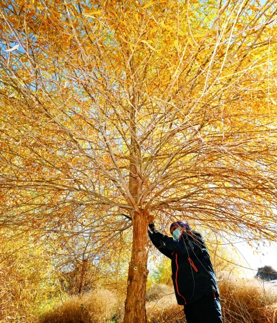 10月28日,德力格为胡杨树修枝。“时代楷模”苏和是内蒙古阿拉善盟退休干部,从2004年到2021年间,他和老伴德力格在额济纳旗黑城遗址边种下了9万棵梭梭苗,用3500亩的梭梭林为黑城遗址筑起了一道宽500米、长3公里的生态屏障,他被誉为“大漠胡杨”“沙漠愚公”。2021年,苏和老人去世。德力格和他们的孩子依然坚守在梭梭林,守护着苏和老人的绿色成果,并将其不断扩大。新华社记者 刘金海/摄