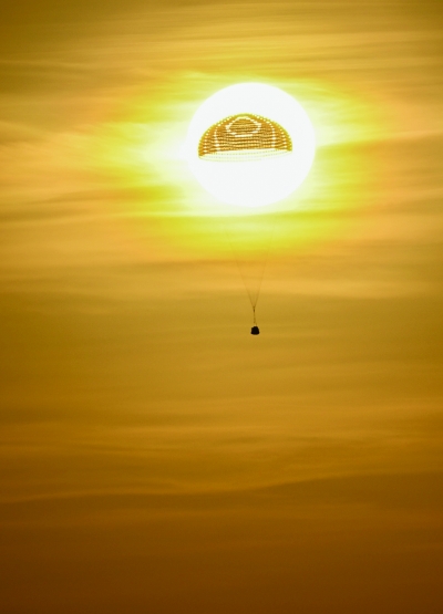 清晨,东风着陆场上的搜救队伍早已准备就绪,随时准备出发。就在大家安静守候的过程中,一轮红日从东边的地平线喷薄而出,映红了半边天。西北回望,一轮凸月正缓缓落下。还没来得及仔细欣赏这日月同辉的景致,只听嘭的一声巨响从高空传来。