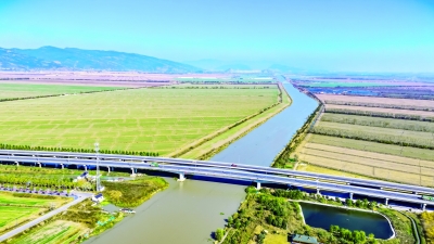 金秋时节的江苏连云港云台山脚下,成片的金色稻田在阳光下耀眼夺目,一条宽阔的长河静静川流在广袤的大地上,它像一条绿色的玉带围住了云台山。