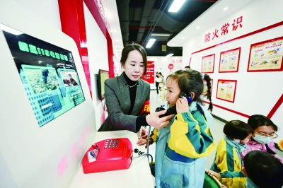 11月6日,在江苏省淮安市金湖县苏宁易购消防科普体验馆,工作人员指导小朋友学习拨打火警电话。 全国消防日临近,各地举行丰富多彩的消防宣传教育活动,帮助人们学习消防知识,提升安全意识。今年11月9日是第32个全国消防日。从2017年开始,每年的11月为全国消防宣传月,今年的活动主题为“预防为主,生命至上”。