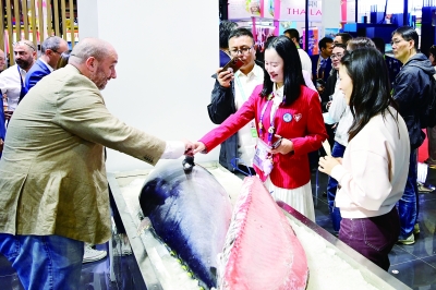 另一边,马耳他的蓝鳍金枪鱼在它的进博首秀上大放异彩,不少观展人员对这个庞然大物兴趣浓厚。相关工作人员告诉记者,这次马耳他蓝鳍金枪鱼能顺利亮相进博会,离不开中国海关总署今年出台的17条支持进博会的便利措施。一个多月前马耳他驻上海总领事馆联系上海海关,希望批准马耳他蓝鳍金枪鱼参展第六届进博会,以此推动蓝鳍金枪鱼等水产品对华准入议程,上海海关据此指定专人与马耳他方面对接,安排细化了一整套安全便捷的监管服务流程。相关负责人告诉记者,经过这次惊艳亮相,马耳他水产品已经收获许多意向合作邀约,他们期待借助进博会开拓更大市场。