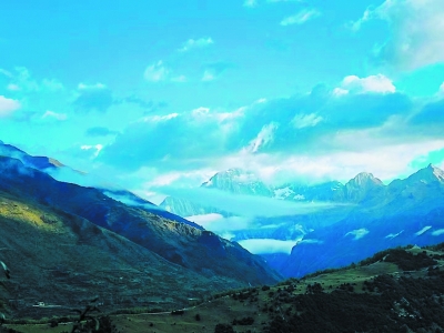 车子行驶在巴郎山的盘山公路上,刚转过一个弯,全车人不约而同地惊呼:“哇!”毫无防备地,美景就突然在眼前铺陈开来。我们所在的猫鼻梁,是远眺四姑娘山全景的最佳观景台。只见近处白云铺满长长的峡谷,远处四座海拔5000米以上的雪峰,在飘渺的云雾之中若隐若现。幺妹峰、三峰、二峰、大峰四座雪峰,从左到右依次排开,在纯净得无一丝杂质的蓝天映衬下,美得令人窒息。