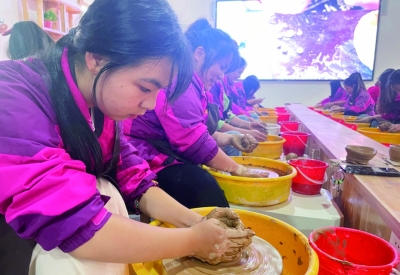 脚踩踏板控制转速,手捧泥团塑造形状……河南省信阳市商城县郭窑村郭窑小镇研学基地,一群着装统一的游客正饶有兴致地体验拉坯。周女士告诉中国妇女报全媒体记者:“我们是来团建的,亲身体验陶艺制作非常有趣。”