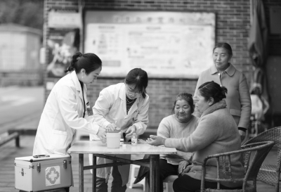 11月14日,在贵州省赤水市丙安镇,卫生院的医务人员为群众测血糖。 11月14日是世界防治糖尿病日,多地开展形式多样活动,免费为群众测血糖、量血压,讲解糖尿病防控知识,提高人们防治糖尿病的意识。 新华社发(王长育/摄)