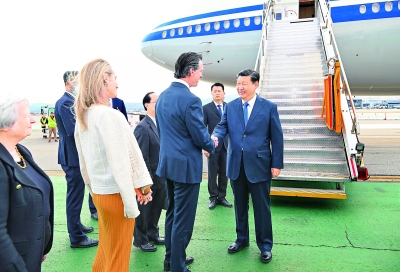 习近平乘坐专机抵达旧金山国际机场时,受到美国加利福尼亚州州长纽森、财政部长耶伦等美方代表热情迎接。