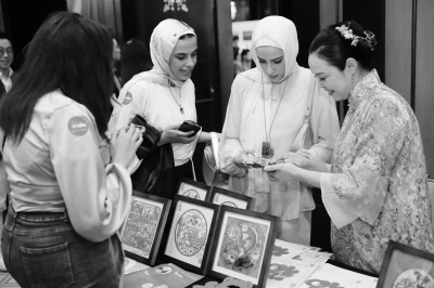 11月19日,在埃及开罗举行的粤港澳大湾区世界级旅游目的地推介暨“魅力广东”视觉展上,人们在非遗展区了解剪纸。 当日,由广东省人民政府新闻办公室、广东省文化和旅游厅、开罗中国文化中心主办的粤港澳大湾区世界级旅游目的地推介暨“魅力广东”视觉展在埃及开罗举行。 新华社记者