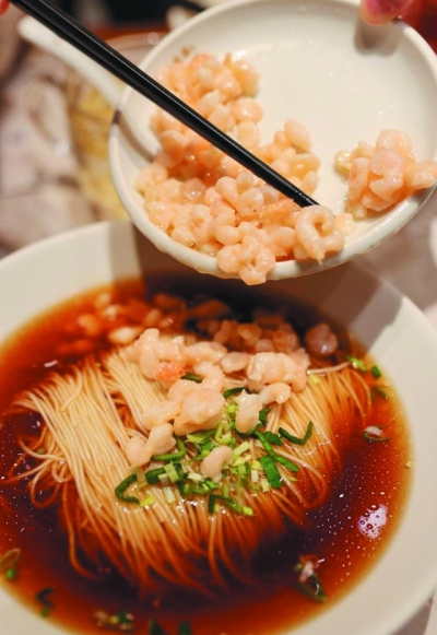 苏州面讲究的就是浇头。“琼林阁”的一碗“三虾面”,所谓的三虾指的是虾仁、虾籽和虾脑。盛在高高的温润青盏里,颗颗虾仁晶莹剔透,带着迷人的嫩粉色,虾籽如繁星点点,是江南的精致格调;根根细面三折于点点酱色的宽汤中(我喜欢宽汤,很多人吃三虾面更喜欢甩干,享受黏糊的甜咸鲜),葱花点翠,将盏中的三虾慢拨于碗中,就成了一幅色泽明快的画,简直不忍搅拌。面条吸收了高汤的精华,香而劲道,不粘不腻,虾脑紧实,虾仁Q弹嫩滑,滋味甘洌,再伴着虾籽的点点咸鲜,简直是口腔、舌尖、味蕾的曼妙幸福。