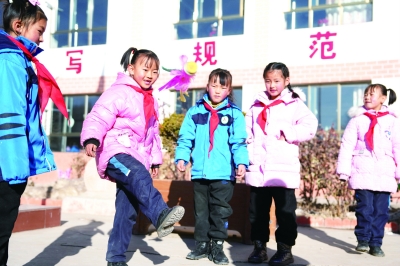 12月25日,积石山县柳沟乡阳山希望小学的学生在课间做游戏。    当日,甘肃积石山地震灾区中小学校开始复课。据积石山县教育局介绍,全县244所学校中,经鉴定能安全使用的学校,学生在12月25日至29日陆续返校上课,没条件开学的学校,教师下沉到安置点开展教学辅导,以尽早恢复教学秩序。    新华社记者 陈斌/摄