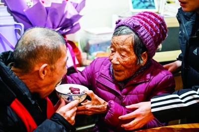 2023年12月31日,在江苏省常州市溧阳市埭头镇田螺圩村,史八妹喂李永吃汤圆。    2023年12月31日,江苏省常州市溧阳市埭头镇田螺圩村十分热闹。从内蒙古二连浩特市长途跋涉1800公里的李永一进家门,便跪倒在已97岁高龄的生母史八妹的怀中,高兴与激动的泪水夺眶而出。    20世纪50年代末60年代初,3000多名孤儿从南方多省市来到内蒙古大草原,在当地群众的抚养下成长,成就了“三千孤儿入内蒙”的佳话,他们也被亲切地称为“国家的孩子”,李永就是其中之一。    60多年来,这些“国家的孩子”大多已经步入老年,很多人“人生当知来处”的想法越来越强烈。得益于2021年公安部组织开展的“团圆行动”,以及持续完善健全的DNA大数据库,一个又一个“国家的孩子”寻亲成功。新华社记者 连振/摄