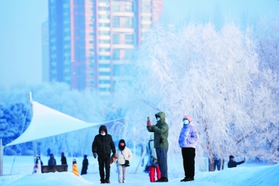 1月3日,市民在哈尔滨市湘江公园欣赏、拍摄雾凇景观。 当日,降雪后的冰城哈尔滨市出现雾凇景观,大地银装素裹,玉树琼枝美如画卷。 新华社记者 王建威/摄