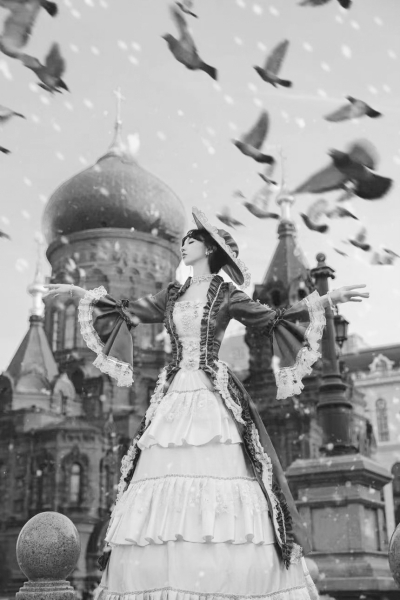 教堂正门前左侧台阶上,一位身着白色公主裙的女孩手捧洁白的鸽子巧笑嫣然;右侧台阶上一位身着一袭黑裙的女孩仰望天空,背上的一対黑色翅膀气势十足;正门的台阶上还有一位身穿紫色蓬蓬裙的“公主”,正手拿权杖威严地看向摄影师的镜头……