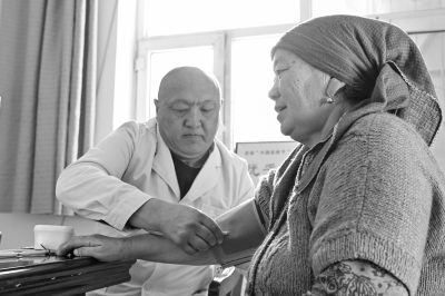 在新疆塔城地区额敏县加依尔牧业幸福驿站旁的柳树沟牧业医院,医生为牧民测量血压(1月12日摄)。   近年来,新疆统筹资源、加大投入,在北部主要牧区加快推进幸福驿站建设。当地畜牧部门整合人力物力财力资源,派专人入驻幸福驿站,围绕草原建设、民生保障、医疗救助、牲畜防疫、防灾减灾等事项,为牧民提供服务。    新华社记者 丁磊/摄