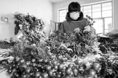 1月16日,乐亭县一家绢花生产企业的工作人员在制作绢花花环。 近年来,河北乐亭县扶持发展以绢花系列产品为主的工艺品制作产业,采取“政府+企业+农户”的方式,为农村妇女提供就业岗位。目前,乐亭县生产的绢花产品出口到欧洲、中东及东南亚等地,带动当地近千名农村妇女实现就业增收。 新华社记者