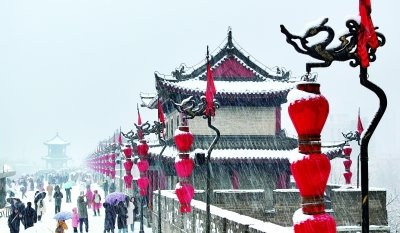 1月16日拍摄的西安城墙(无人机照片)。 当日,西安迎来降雪。 新华社记者 刘潇/摄