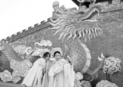 一月二十四日,游客在河北省石家庄市正定古城南城门花灯前拍照。 春节将至,各地年味渐浓,呈现出红红火火迎新春的喜庆氛围。 新华社发 陈其保/摄
