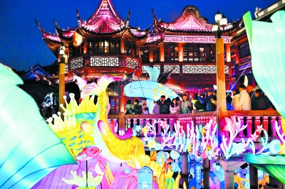 1月21日,游客在豫园九曲桥上赏灯。当日,2024上海豫园民俗艺术灯会正式亮灯。今年豫园灯会续写“山海奇豫记”,以“海经篇”为主题,生肖龙灯、海底世界、鱼群起舞、奇幻仙境等场景让游客在灯火绚烂的国风幻境中喜迎龙年新春。 新华社记者 刘颖 摄
