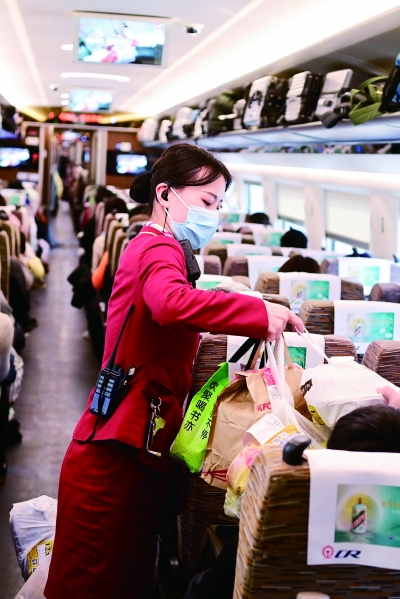 13时21分,列车经停徐州东站。记者发现,尽管上下车乘客不多,但餐饮外卖让张瑞和同事们瞬间紧张起来。乘务员孙馨告诉记者:“我们必须在有限时间内将订餐准确无误地送到乘客身边,非常考验体力。”除此之外,孙馨的工作还包括协助乘客摆放行李,验票、补票等。已有多年工作经验的孙馨表示:“希望用自己的爱心、细心、耐心,让每一名旅客都能开开心心地回家过年。”