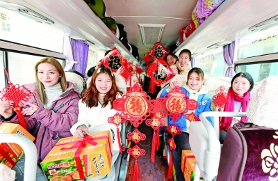 1月28日,在浙江省台州市仙居县,一家企业的甘肃籍员工在返乡过年专车上展示福字和慰问品。 春节临近,浙江省仙居县人力社保局联合企业组织专车“点对点”免费送员工返乡过年,并为返乡员工赠送慰问大礼包,让员工高高兴兴回家过年。 新华社发(王华斌/摄)