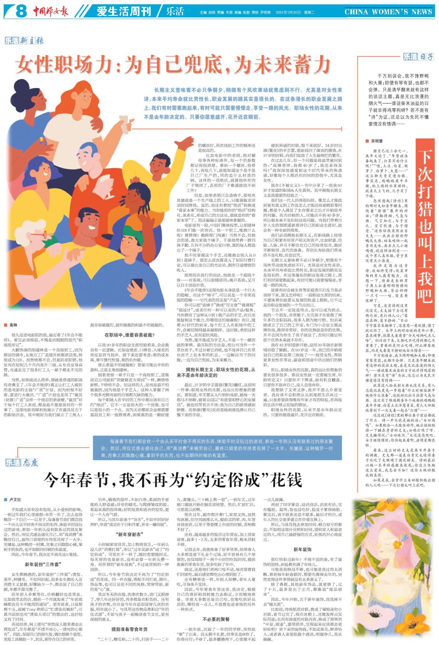 《中国妇女报》(电子版)的一切内容(包括但不限于文字、图片、PDF、图表、标志、标识、商标、版面设计、专栏目录与名称、内容分类标准以及为读者提供的任何信息)仅供中国妇女报读者阅读、学习研究使用,未经中国妇女报及/或相关权利人书面授权,任何单位及个人不得将《中国妇女报》(电子版)所登载、发布的内容用于商业性目的,包括但不限于转载、复制、发行、制作光盘、数据库、触摸展示等行为方式,或将之在非本站所属的服务器上作镜像。否则,中国妇女报将采取包括但不限于网上公示、向有关部门举报、诉讼等一切合法手段,追究侵权者的法律责任。
